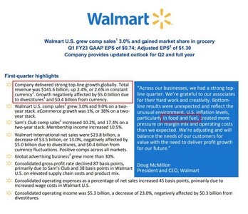 值得一提的是,根据沃尔玛2023财年第一季度报告,沃尔玛一季度总营收达1416亿美元,同比增长2.4%,超出市场预期的1389.4亿美元,净利润为20.5亿美元,同比降低25%,低于市场预期。