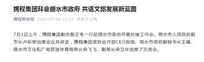 携程集团与浙江丽水市政府共话文旅发展蓝图