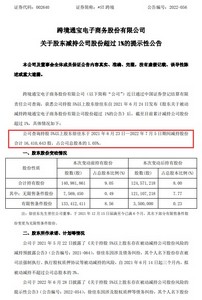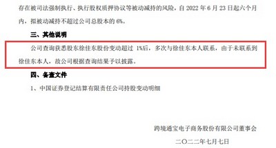 公告称,公司近日通过中国证券登记结算有限责任公司查询,获悉公司持股5%以上股东徐佳东自2021年6月24日发布《股东关于被动减持跨境通宝电子商务股份有限公司股份超过1%的公告》后,截至目前累计减持公司股份超过1%,具体情况如下:公司查询持股5%以上股东徐佳东于2021年6月23日—2022年7月5日期间减持股份合计16,410,643股,占公司总股本的1.05%。