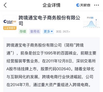 天眼查资料显示,跨境通前身是创立于1995年的百圆裤业,前期主要经营服装零售业务,在2011年12月8日,深圳交易所A股市场挂牌上市。随着全球化与互联网化的发展,跨境电商行业快速崛起,公司在2014年7月,通过重大资产重组进入跨境电商。