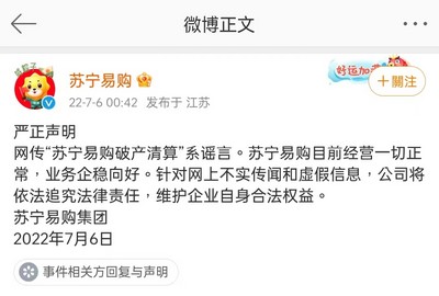 7月6日凌晨,苏宁易购紧急发布声明,称网传的“苏宁易购破产清算”系谣言,并表示目前经营一切正常,业务企稳向好。声明发出后,苏宁易购股价仍是下跌近5%。
