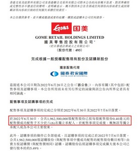 7月7日消息,昨日晚间,国美零售控股有限公司发布公告称,完成根据一般授权配售现有股份及认购新股份。配售事项及认购事项的完成已分别于2022年6月30日及2022年7月6日落实。