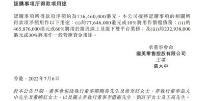 公告显示,认购事项所得款项净额约为7.76亿港元,国美零售拟将认购事项的相关所得款项净额用作以下用途:约7764.6万港元或10%将用作偿还债务;约4.66亿港元或60%将用于扩展在线及线下双平台业务;及约2.33亿港元或30%将用作一般营运资金用途。