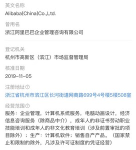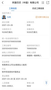 天眼查资料显示,阿里巴巴(中国)有限公司成立于2007年3月26日,法定代表人为张勇,注册资本15298万美元,经营范围包括:企业管理;计算机系统服务;电脑动画设计;经济信息咨询服务;成年人的非证书劳动职业技能培训和成年人的非文化教育培训;生产:计算机软件;销售自产产品。