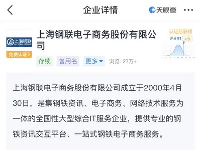 天眼查资料显示,上海钢联成立于2000年4月30日,是集钢铁资讯、电子商务、网络技术服务为一体的全国性大型综合IT服务企业,提供专业的钢铁资讯交互平台、一站式钢铁电子商务服务。