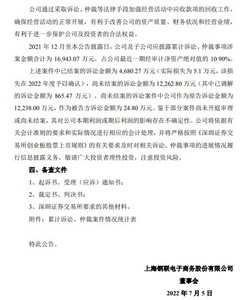 7月6日消息,上海钢联电子商务股份有限公司(以下简称上海钢联或公司)日前发布关于累计诉讼、仲裁情况的公告(以下简称公告)。