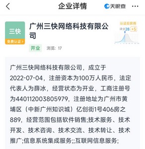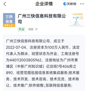 7月6日消息,天眼查App显示,7月4日,广州三快信息科技有限公司、广州三快网络科技有限公司成立,注册资本均为100万人民币,法定代表人均为薛冰,经营范围均为:信息系统集成服务技术服务、技术开发、技术咨询、技术交流、技术转让、技术推广;软件销售;互联网信息服务。