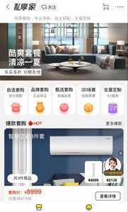 消费者进入“私享家”界面后,可以根据自家不同的装修风格,选择不同线上3D样板间。比如简洁的北欧风、复古的新中式、轻奢的欧式、原木的日式等。样板间中有苏宁专业导购设计好的家电套购方案,消费者可沉浸式选购整屋家电。