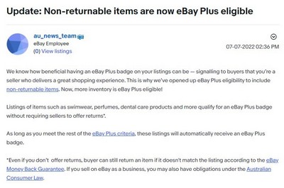 eBay澳大利亚站公告 eBay Plus计划扩展至不可退货商品