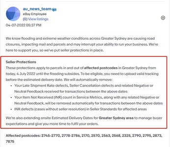值得一提的是,近日,eBay澳大利亚站发布消息,澳大利亚悉尼地区的洪水和极端天气状况导致道路封闭,影响邮件和包裹并可能中断卖家的业务运营能力。由此,eBay将为卖家提供支持,并实施保护措施。