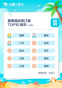 去哪儿平台数据显示,今年暑期(7-8月)酒店预订量TOP10城市是:成都、重庆、广州、北京、杭州、长沙、三亚、西安、上海、昆明。