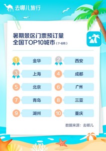 从去哪儿数据来看,截至目前,在今年7月-8月之间出行游玩的景区门票预订量来看,前十热门景区中,主题乐园占据了一半。从景区预订门票量来看,暑期top10热门旅游城市是:金华、西安、上海、成都、北京、广州、青岛、三亚、湖州、重庆。