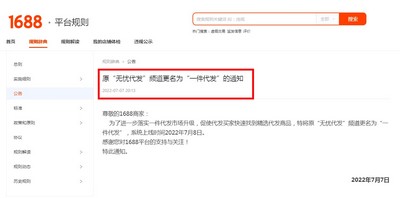 1688平台“无忧代发”频道更名为“一件代发”