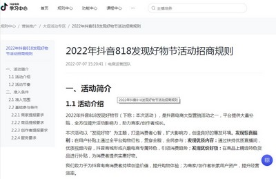 7月7日消息,今日,抖音发布2022年818发现好物节活动招商规则(以下简称“规则”),规则称,2022年抖音818发现好物节(下称:本次活动),是抖音电商大型营销活动之一,平台提供大量补贴,全方位提升活动影响力,助力商家/创作者成长。
