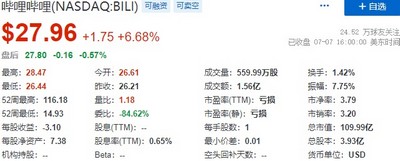 逸仙电商涨7.32%,报1.76美元,总市值11.12亿美元;哔哩哔哩涨6.68%,报27.96美元,总市值109.21亿美元;携程涨6.95%,报26.63美元,总市值182.01亿美元;唯品会涨5.30%,报10.53美元,总市值69.09亿美元;每日优鲜涨5.40%,报0.32美元,总市值7630.98万美元;途牛涨3.79%,报1.37美元,总市值1.69亿美元。