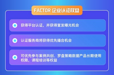 FACTOR企业认证服务商将获得抖音平台认证,并获得宣发曝光机会;优先撮合机会;可优先参与案例共创、罗盘策略数据产品长期使用权限,课程培训等权益。