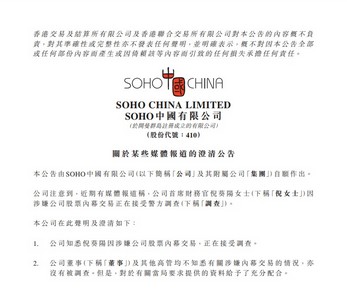SOHO中国在公告中否认了其他董事、高管有被牵连,并称有关调查对集团的业务运作并无重大的不利影响。