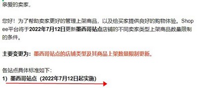 7月8日消息,今日,Shopee官方发布公告称,为了帮助卖家更好的管理上架商品,以及给买家提供良好的购物体验。Shopee平台将于2022年7月12日更新墨西哥站点店铺的不同卖家类型上架商品数量限制的条件。