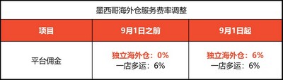 自9月1日起,独立海外仓的平台佣金服务费率调整为6%,一店多运的服务费率保持不变,为6%。