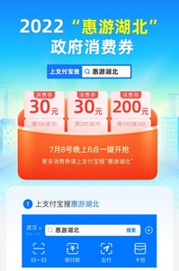 支付宝方面,活动期间,符合活动参与条件的用户可点击支付宝首页氛围图或搜索“惠游湖北”,进入活动会场,会场页面上有三种品类不同面额共计11种消费券。