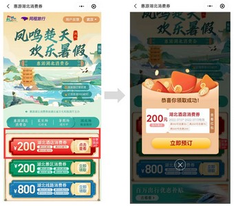 同程方面,活动期间,消费者进入同程旅行APP或同程旅行小程序,首页搜索框输入“湖北消费券”、“惠游湖北”、“湖北”、“湖北旅游”等关键词,进入惠游湖北消费券活动专题页。在专题页内领取酒店、景点、线路任意消费券,点击“立即领取”,领取成功后将会出现弹屏,红包状态将变成“已领取”。
