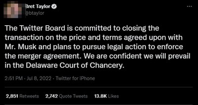 Twitter董事长Bret Taylor在消息爆出后发布推文,表示公司致力于按照达成的协议价格和条款完成交易,为此不惜将马斯克起诉到特拉华州商事法院。