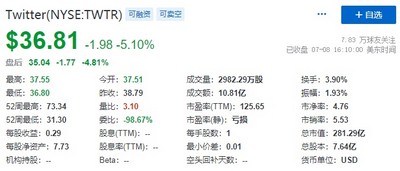 据了解,Twitter当天股价收盘于36.81美元。消息传出后,Twitter盘后股价顺势暴跌至34美元左右,跌幅一度近8%。目前Twitter盘后价格稳定在35美元左右,跌幅近5%。