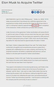 晚些时候,多家媒体报道称,推特公司内部正在进行最后的谈判,以接受马斯克的收购提议。4月25日,推特公司董事会公开一致接受了440亿美元的收购要约。