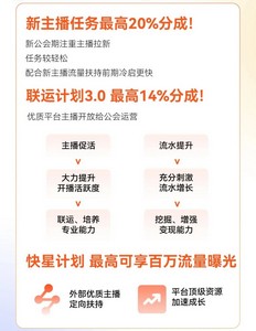 同时,为了提高新公会的拉新积极性,快手直播还设置了新主播任务,最高可以拿到20%的额外分成奖励,加上“联运计划3.0”高达14%的分成,公会主播在完成拉新、开播时长和流水等要求后,每个月最高可额外获得最高34%流水分成。