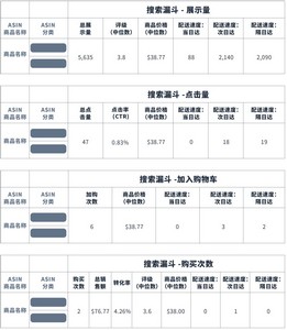 上述数据如何进行关联分析,首先,通过展示量、点击率、加购率、加购转化率这几个直接决定ASIN销量高低的转化漏斗,判断各销售环节是否存在待优化问题。