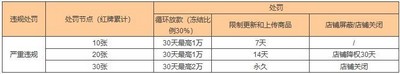 严重违规行为的处罚红牌累计10张,循环放款(冻结比例30%)限制为30天最高借款1万,限制更新和上传商品7天;红牌累计20张,循环放款(冻结比例30%)限制为30天最高借款1万,限制更新和上传商品14天,店铺降权30天;红牌累计30张,循环放款(冻结比例30%)限制为30天最高借款2万,永久限制更新和上传商品,店铺关闭。