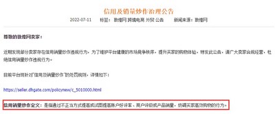 公告显示,敦煌网近期发现部分卖家存在信用销量炒作违规行为,为了维护平台健康的市场竞争秩序,提升买家的购物体验,敦煌网将对信用及销量炒作行为进行处罚。