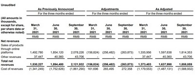 公告显示,每日优鲜调整后的2021年第一至第三季度的营收由15.30亿元人民币(下同)、18.94亿元、21.22亿元,减少至13.73亿元、16.38亿元、18.58亿元;收入成本从13.41亿元、17.53亿元、18.61亿元,减少至11.80亿元、14.87亿元、15.89亿元。