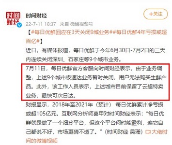 对于上述消息,7月11日,每日优鲜官方客服对时间财经表示,由于业务调整,上述9个城市极速达业务暂时关闭,用户无法购买生鲜产品。此外,该工作人员表示,上述城市目前保留了云超特卖业务,最快可次日达。