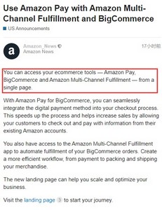 7月12日消息,日前,亚马逊美国站发布公告称卖家现在可以在同一页面结合使用Amazon Pay、BigCommerce和Amazon Multi-Channel Fulfillment这三个电商工具。