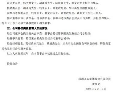 7月12日消息,深圳齐心集团股份有限公司(以下简称齐心集团或公司)日前发布关于董事会换届选举完成及聘任高级管理人员的公告(以下简称公告)。