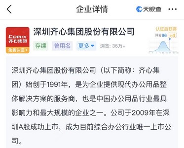 天眼查资料显示,齐心集团始创于1991年,是为企业提供现代办公用品整体解决方案的服务商,也是中国办公用品行业最具影响力和最大规模的企业之一。公司于2009年在深圳A股成功上市,成为目前综合办公行业唯一上市公司。