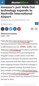 今年6月,亚马逊的Just Walk Out技术已扩展到纳什维尔国际机场、休斯顿的Minute Maid公园、纽约的拉瓜迪亚机场等场所。据了解,该技术允许客户在购买商品时绕过结账。购物者在进入时刷信用卡或在Amazon One设备上挥动手掌,并在完成购物后带着他们的物品离开。