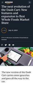 据了解,这种购物车使用户不再需要排队结账,在物品放入购物车时,它可以对商品进行跟踪和统计。亚马逊于2020年9月在其Fresh杂货店内推出了Dash Cart。