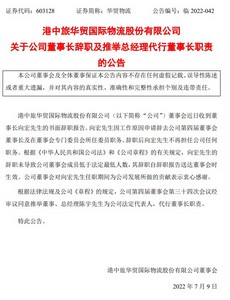 7月12日消息,近日,港中旅华贸国际物流股份有限公司(以下简称“华贸物流”)发布公告称,董事会收到董事长向宏的书面辞职报告。向宏因工作原因申请辞去公司第四届董事会董事长及在董事会专门委员会所任委员职务。辞职后向宏不再担任公司任何职务。