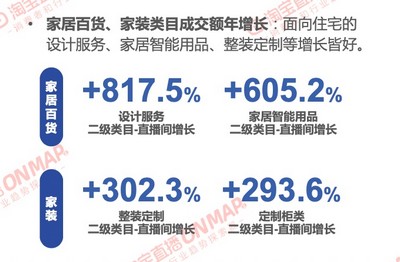 2021年,直播间家居百货、家装成交增长显著,家居智能用品年增长超600%,设计服务超800%,整装定制二级类目-直播间增长超300%,定制柜类二级类目-直播间增长293.6%。