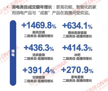 此外,年轻的“懒宅族”爆发出了极大的消费潜力,他们越发追求智能化、精致化的生活体验,带动智能家居的爆发式增长,2021年淘宝直播间新风空调增长达1469.8%,整体厨房套装增长达634.1%,洗烘套装二级类目-直播间增长436.3%,冰吧二级类目-直播间增长414.3%,空调套装二级类目-直播间增长391.4%,家电套装二级类目-直播间增长270.9%。