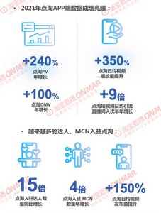 值得一提的是,点淘作为流量新场域,借助短直联动的新模式,为淘宝直播的成交转化注入新活力。越来越多的达人、MCN入驻点淘,报告数据显示,2021年点淘入驻达人数量同比增长15倍,入驻MCN数量年增长4倍。2021年,点淘PV年增长超240%,GMV年增长超100%。