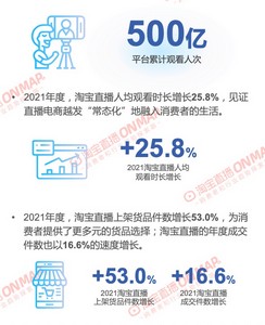 淘宝直播自2016年成立以来,平台至今已累计超过500亿人次观看。根据本次报告数据显示,2021年度,淘宝直播的人均观看时长增长25.8%,平台上架货品数增长53.0%,淘宝直播成交件数增长16.6%。