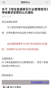 公告显示,主要变更点:对《淘宝直播原石行业管理规范》,更改了卖家的品质分考核方式。