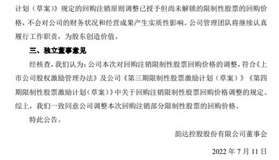 7月11日消息,韵达控股股份有限公司(以下简称韵达股份或公司)日前发布关于因权益分派事项调整公司回购注销限制性股票价格的公告(以下简称公告)。