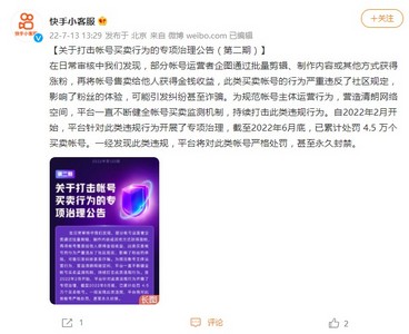 截至今年6月底快手已累计处罚4.5万个买卖帐号
