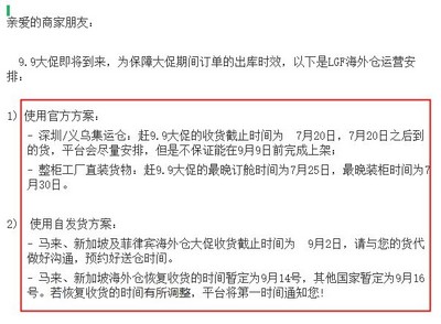 如卖家使用官方送货方案,深圳/义乌集运仓在9.9大促前的收货截止时间为7月20日,7月20日之后到的货,平台会尽量安排,但是不保证能在9月9日前完成上架;