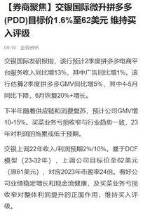 对此,交银上调22年拼多多收入/利润预期2%/10%。基于DCF模型(23-32年),上调拼多多目标价至62美元(原61美元),对应2023年市盈率24倍。看好拼多多业绩稳定增长和现金流健康,及买菜业务亏损收窄对整体利润提升的正面作用,维持买入评级。