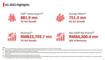 拼多多第一季度营业利润为21.544亿元,非GAAP营业利润为36.772亿元;归属于普通股股东的净利润为25.995亿元,2021年同一季度净损失29.054亿元;归属于普通股股东的非GAAP净利润为42.004亿元,2021年同一季度非公认会计原则净亏损18.903亿元。